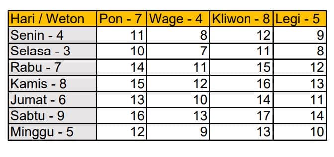 Hari pasar maksudnya ialah Pon, Kliwon, Legi, Pahing, Wage. Sedang nilai angka dari hari Senin ialah 4, hari Selasa nilainya 3, nilai angka hari Rabu ialah 7, untuk hari Kamis nilai angkanya 8, hari Jumat punya nilai angka 6, hari Sabtu punya nilai angka 9 dan hari Minggu nilai angkanya 5.